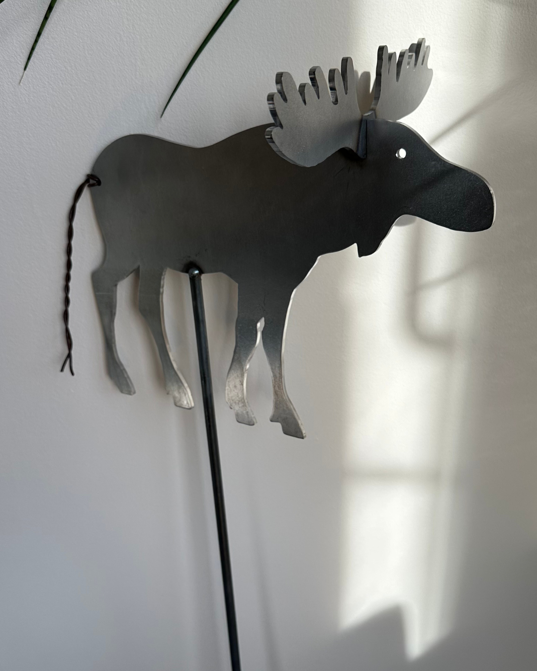 Der Elch ist für draußen geeignet – der Stahl bildet mit der Zeit eine natürliche Rostpatina, die jedes Stück einzigartig macht. Auf den Bildern ist der Elch noch glatt; draußen entsteht der warme, organische Charme.