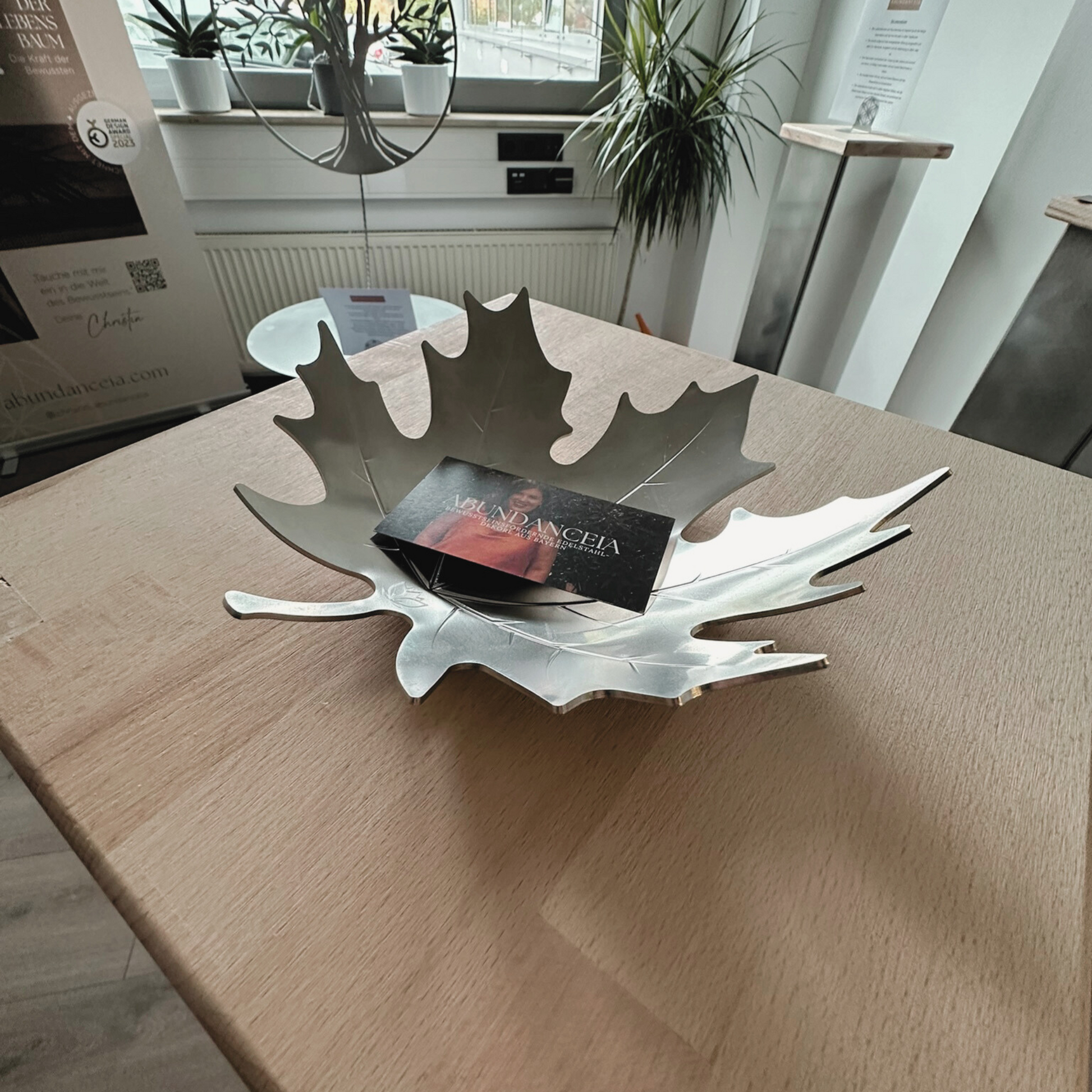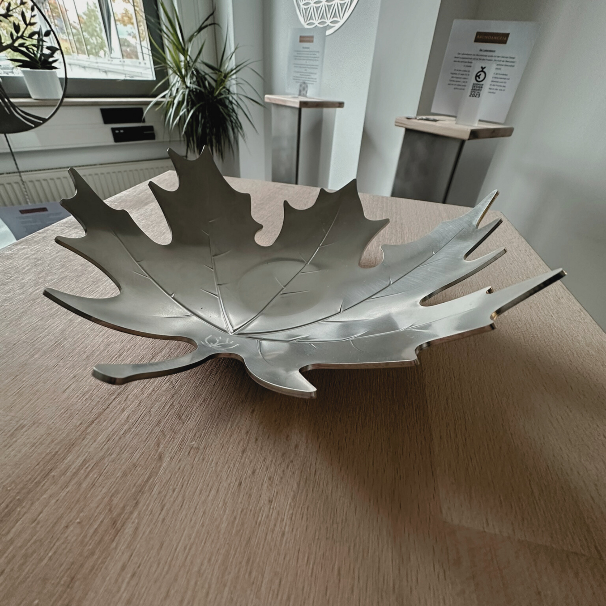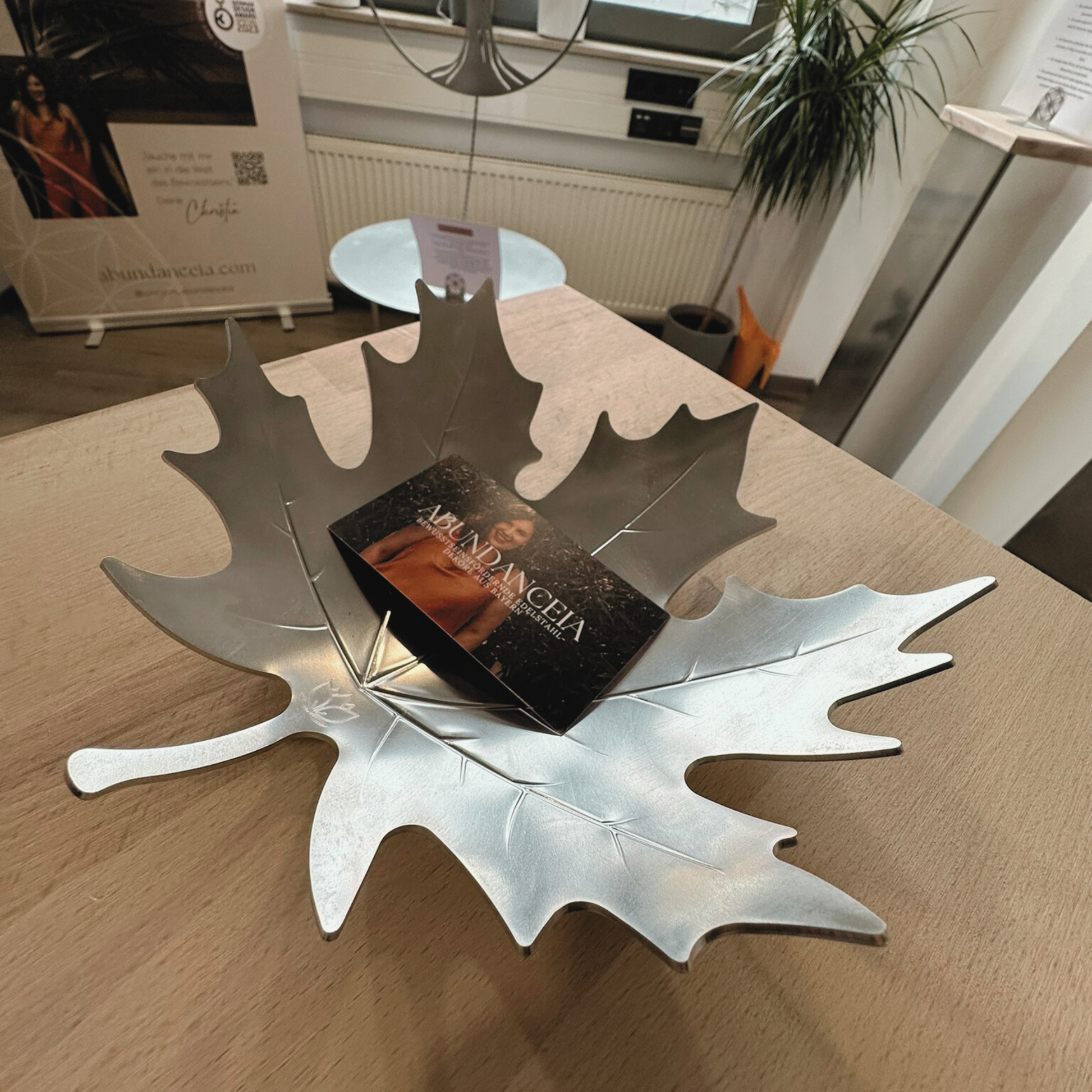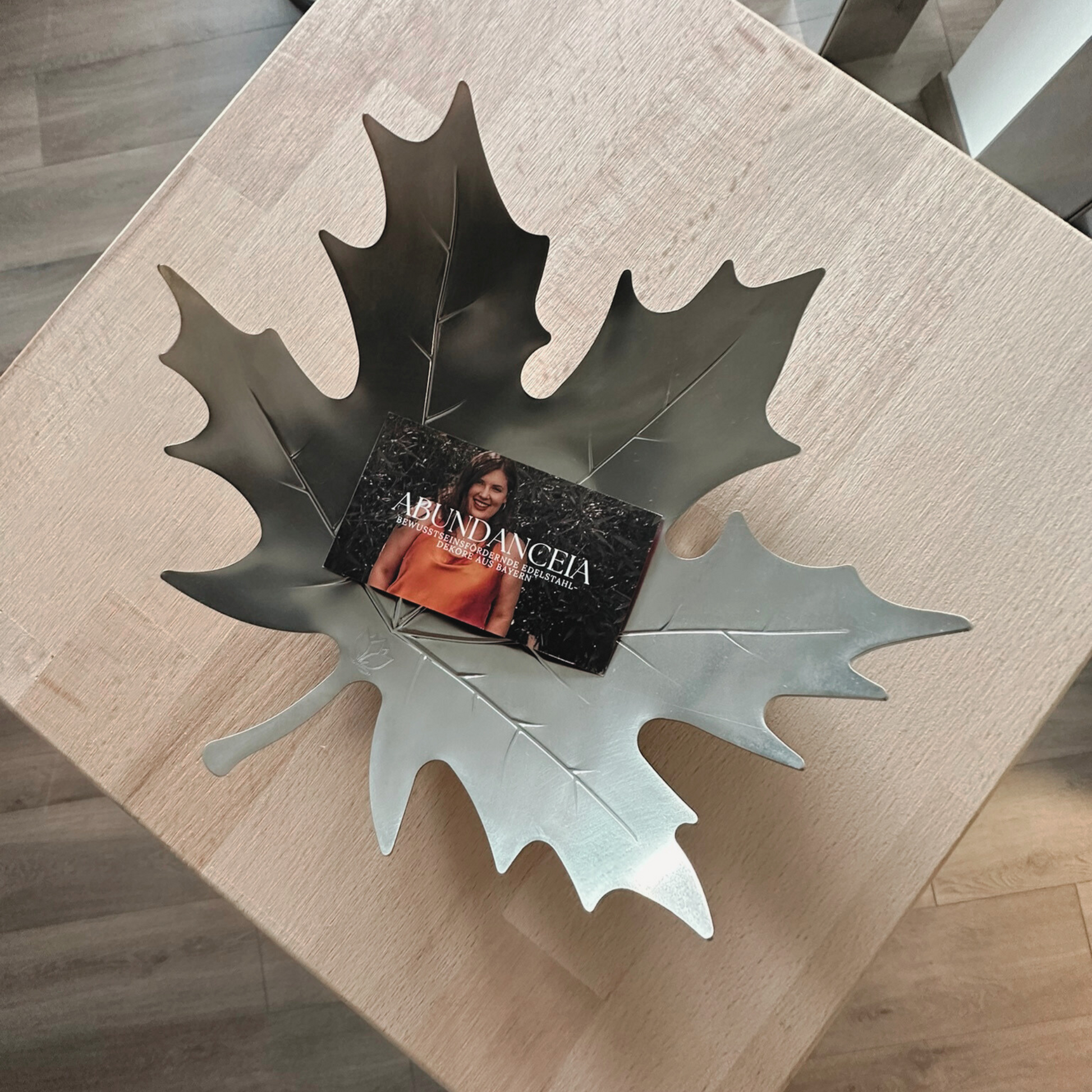 Ein einzigartiges Schmuckstück für Ihr Zuhause: Die Ahornblatt-Schale von Abundanceia wird aus hochwertigem Edelstahl im Familienbetrieb gefertigt und begeistert mit einem vielseitigen Design. Ob als Schlüsselschale, Windlicht oder dekoratives Element.