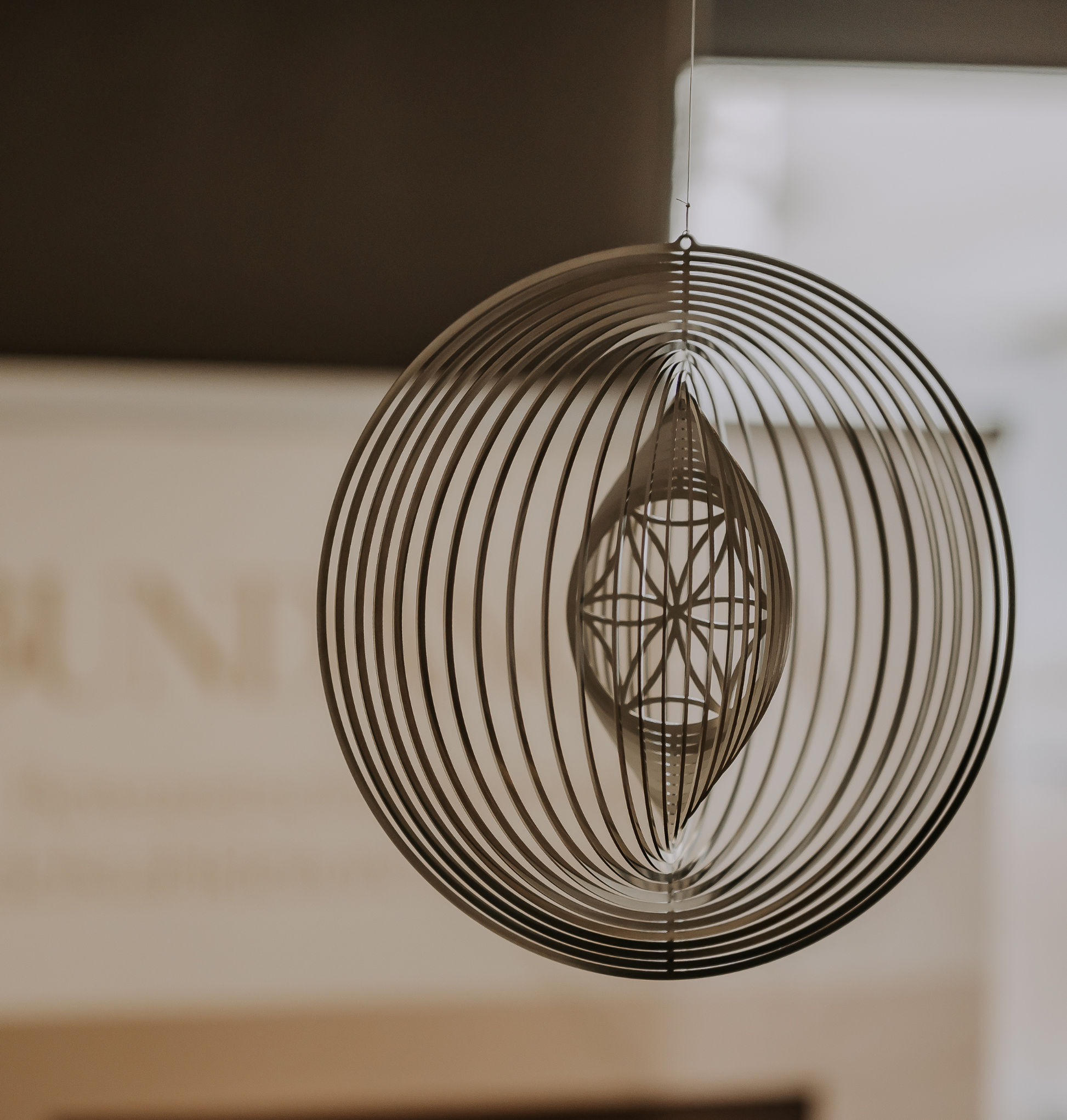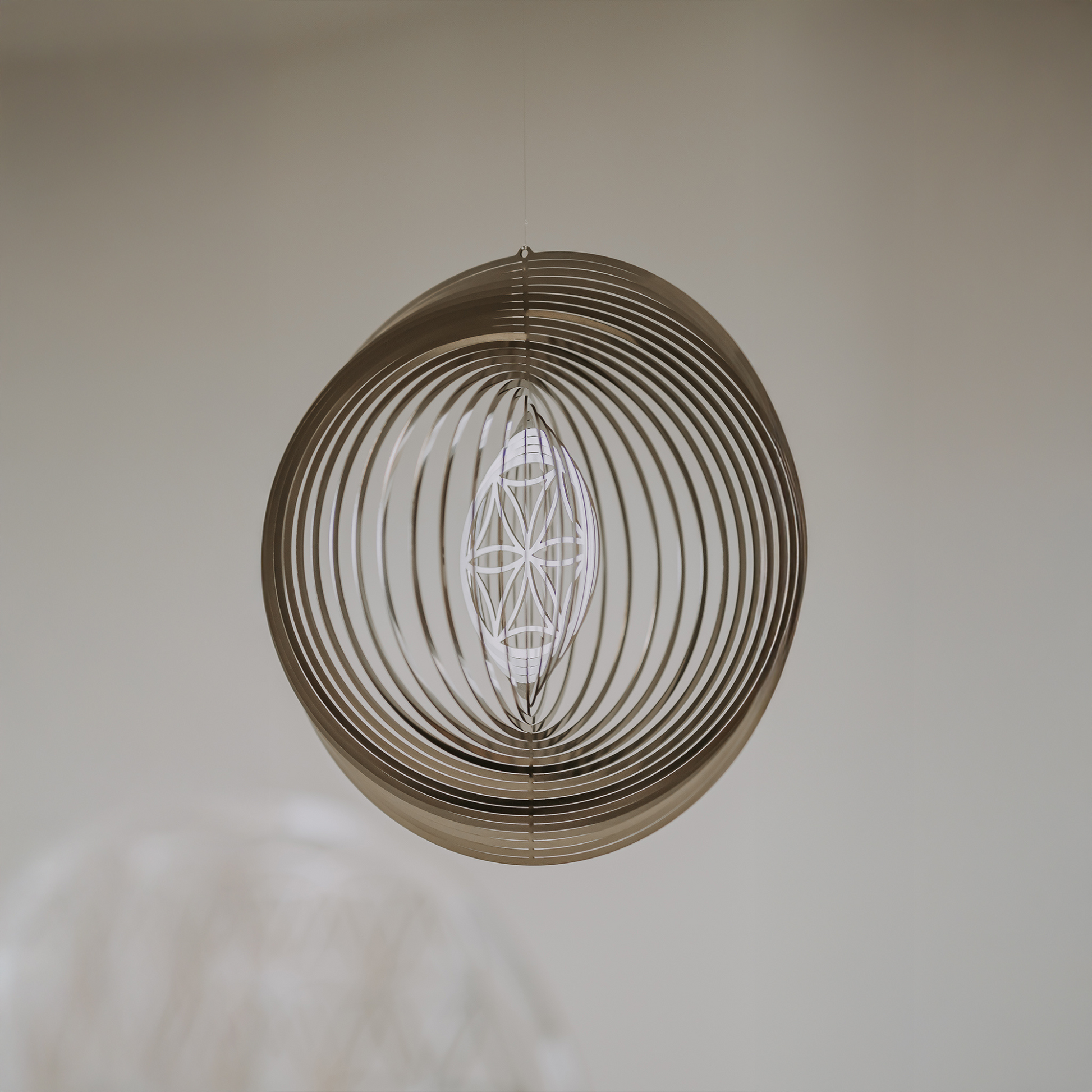 Es finden sich die Details der Lebensblume in dem Windspiel wieder, eine Einheit, ein Zeichen für die Ewigkeit, aus Edelstahl für den Innen- und Außenbereich.